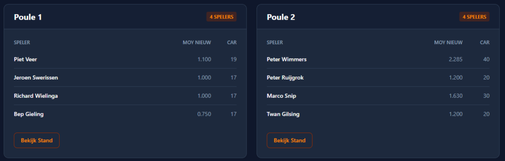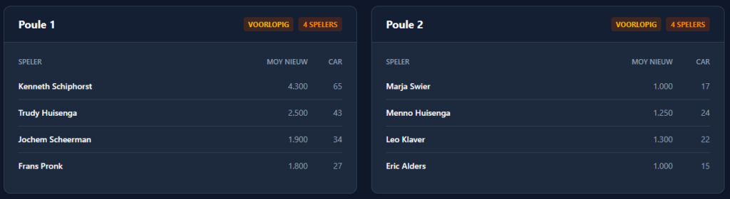 De poule indelingen van het hoofdtoernooi van de Grand Prix driebanden in Capelle.Met twee West-Friezen Sam van Etten en Peter Vlaar waar we natuurlijk net iets harder voor juichen. Donderdag 19 maart (poules A, B, G en H) Vrijdag 20 maart (poules C, D, E en F) Dagelijks vanaf 11.00 uur worden gespeeld. Op zaterdag 21 maart…