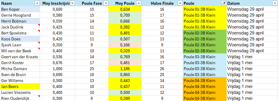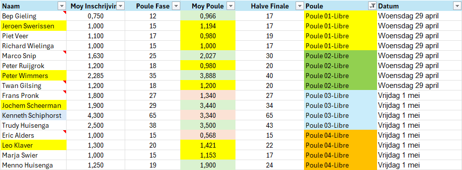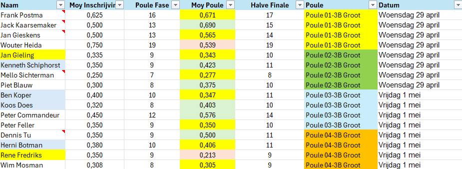 Halve Finale, poule indeling driebanden groot Woensdag 29 april Vrijdag 1 mei